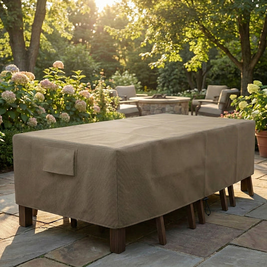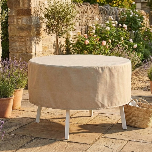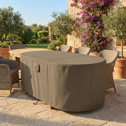 - Mesas de jardín (Rectangulares, Redondas y Ovaladas): Adaptamos la funda a la forma exacta de su mesa. Para mesas redondas y ovaladas, aseguramos un ajuste perfecto sin bolsas ni arrugas.